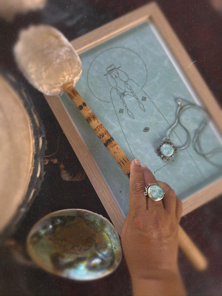 La collaboration avec Jess, créatrice de NUMERO HUIT jewelry est née d’une résonance naturelle entre nos univers. Inspirées par l’esthétique et l’héritage amérindien — entre références aux peuples d’Amérique du Nord et mes propres racines — nous avons imaginé une fusion entre illustration et bijoux . Ensemble, nous avons créé des pendentifs, colliers et une bague, comme une rencontre évidente entre nos sensibilités artistiques.