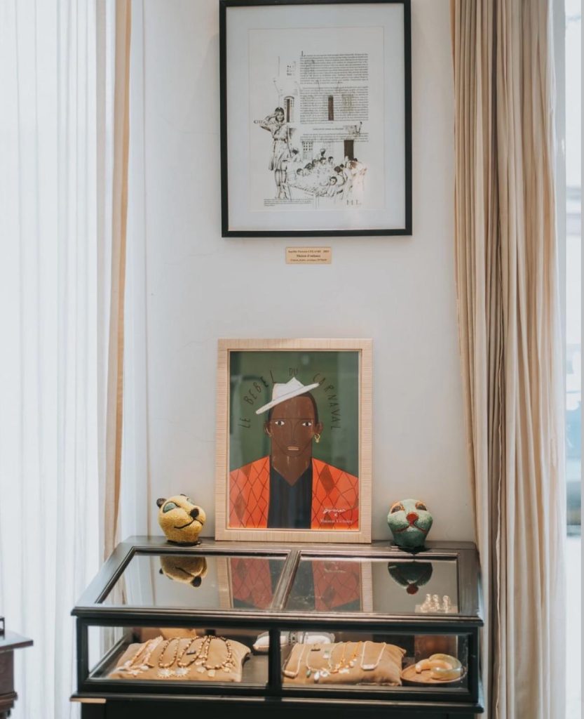 Ma collaboration avec l’hôtel Maison Victoire est née d’une invitation à créer un projet sur mesure, inspiré par l’âme du lieu. Très vite, une évidence s’est imposée : imaginer une rencontre entre le carnaval de Rio de Janeiro et celui de la Guadeloupe — un dialogue vibrant entre couleurs, culture, mouvement et identité.